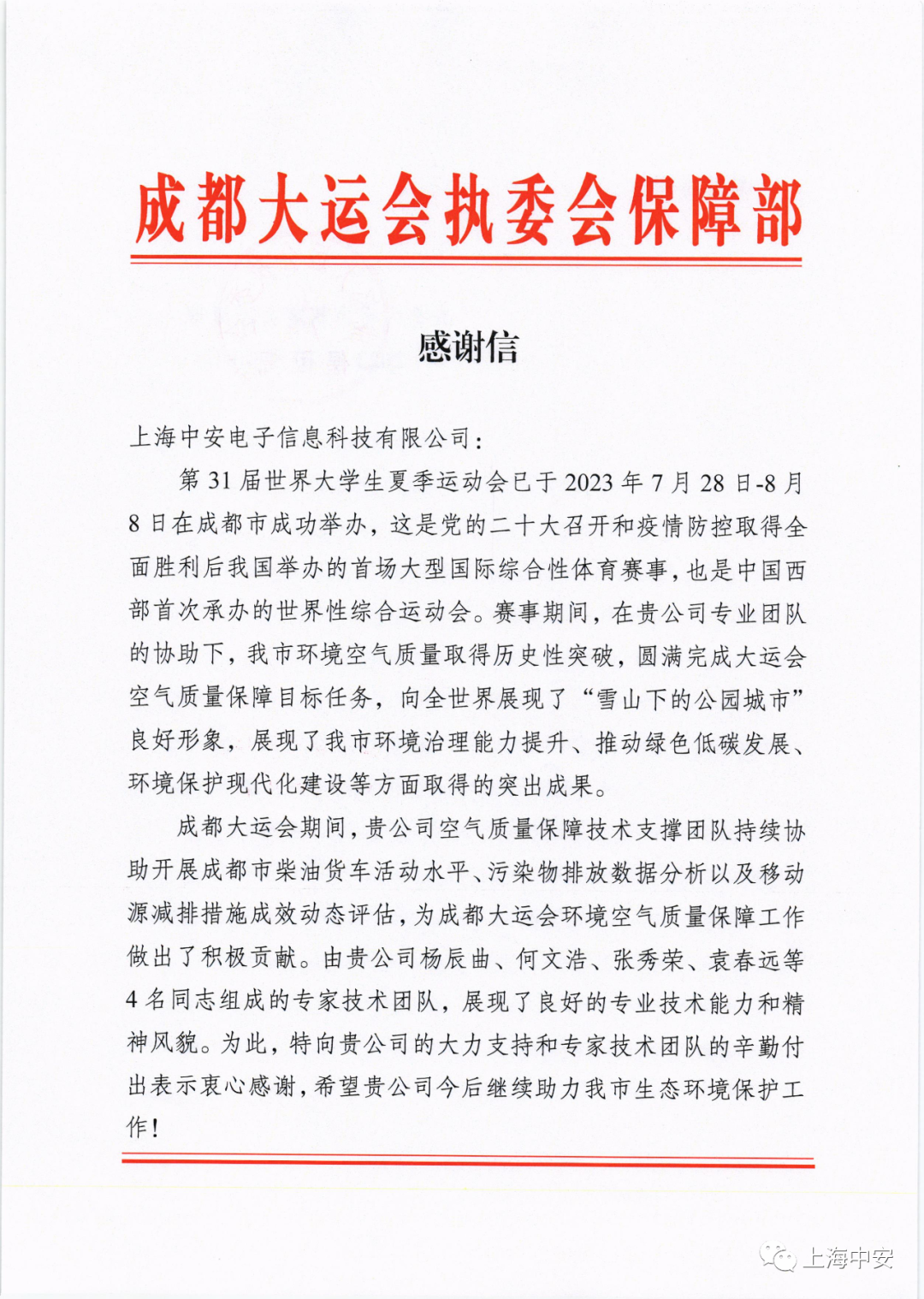 成都大運(yùn)會執(zhí)委會保障部發(fā)來一封感謝信?。?023-10-15)