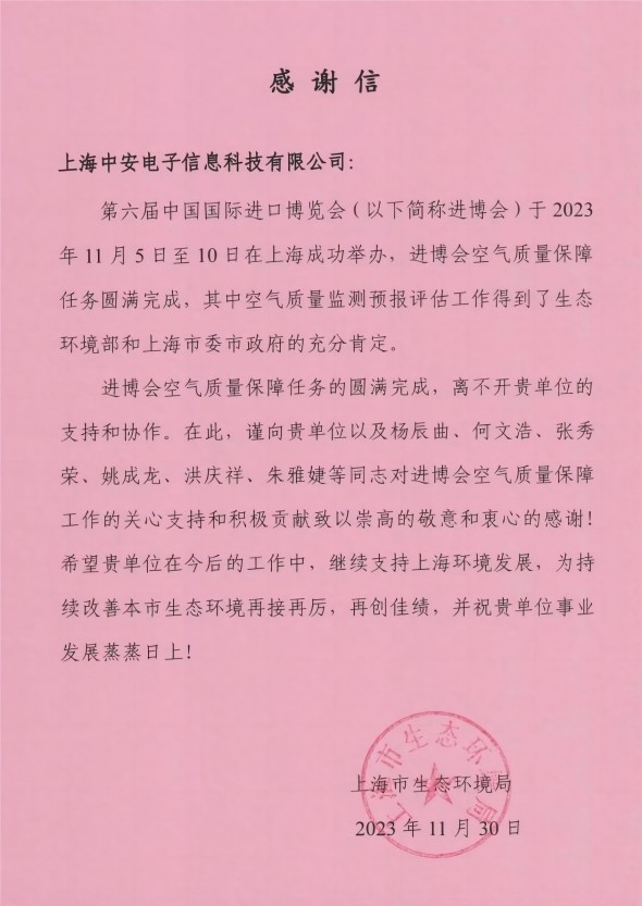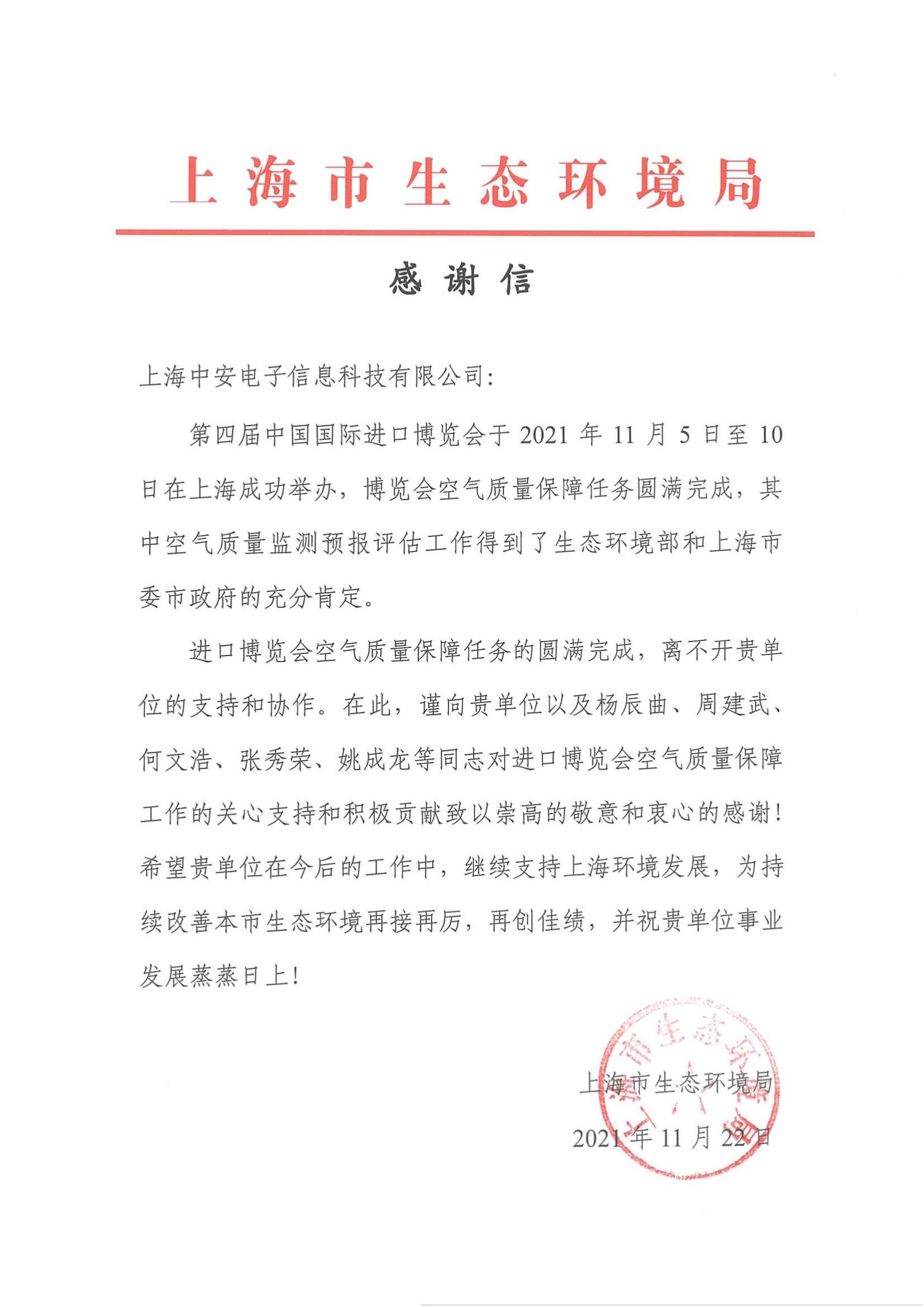 上海環(huán)監(jiān)中心就中安科技在21年國際進(jìn)博會空氣質(zhì)量監(jiān)測預(yù)報工作中杰出貢獻(xiàn)送來感謝信?。?021/12/31)