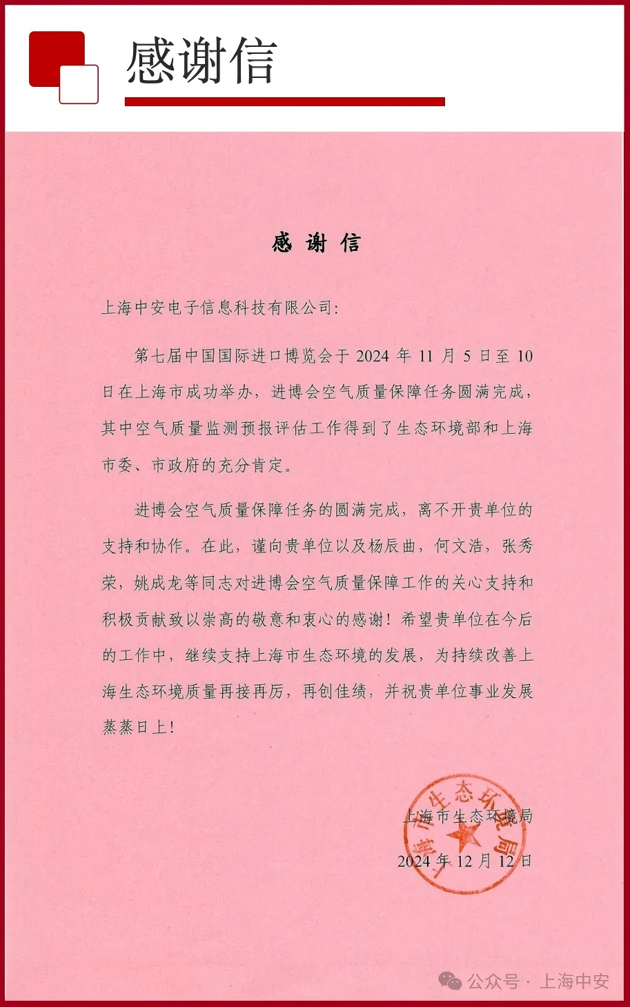 上海市生態(tài)環(huán)境局致上海中安的一封感謝信?。?025-01-10)